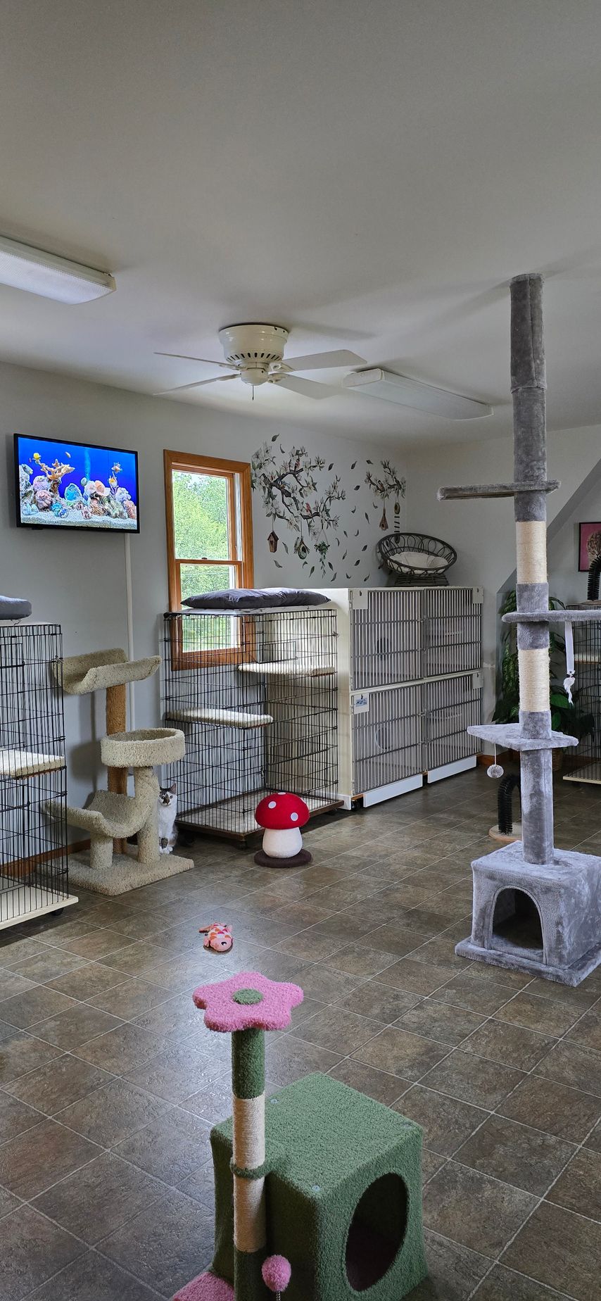 Only one family of cats is allowed to explore the cattery at one time. Plenty of soft perches, hiding spots, and windows for their viewing pleasure. We provide plenty of toys and scratching posts to ensure that your cat is never bored!